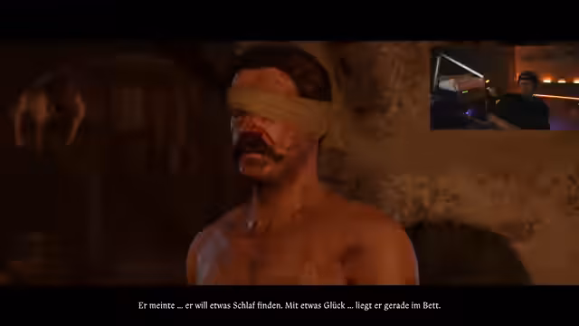 07:05:25Die Szene beginnt mit einem abrupten Erwachen, bei dem der Protagonist von unbekannten Angreifern überrascht wird. Schnell wird klar, dass es sich um feindliche Kräfte handelt, die im Auftrag von Herrn Nebag die Burg zurückerobern und den Kopf des Protagonisten fordern. Die Situation eskaliert, als der Hauptmann und seine Begleiter in eine aussichtslose Lage geraten. Trotz des Widerstands und der Versuche, die Angreifer abzuwehren, werden sie überwältigt. Die Dialoge sind geprägt von Drohungen und der Forderung nach Informationen über Jobst und Wenzel, die sich offenbar mit den Angreifern verbündet haben. Die Gefangennahme ist unvermeidlich, und der Protagonist wird mit der harten Realität der mittelalterlichen Kriegsführung konfrontiert, in der Verrat und Machtspiele an der Tagesordnung sind. Die Verzweiflung der Situation wird durch die rhetorischen Fragen des Protagonisten unterstrichen, der sich fragt, woher die Angreifer ihre Stärke und Entschlossenheit nehmen.