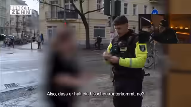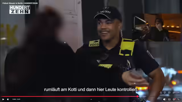 01:33:05Der Stream wechselt zu einem dritten Einsatz in Berlin-Mitte. Ein Polizist versucht, eine Person am Cottbusser Tor zu interviewen. Die Frau wirft der Polizei Diskriminierung vor und äußert den Satz 'die Polizei ist nicht mehr deutsch', nachdem sie am Alexanderplatz aufgrund ihrer Hautfarbe beleidigt worden war. Der Polizist weist den Rassismusvorwurf zurück und fragt nach, ob die Aussage 'ACAB' als Beleidigung zu werten sei. Die Situation endet ohne klare Lösung und bleibt angespannt.