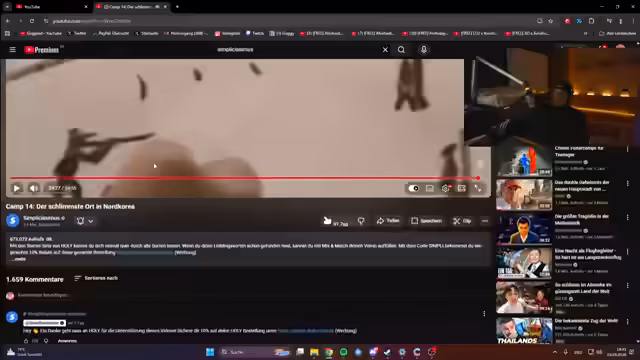 00:35:43Die Frage der Zuschauer, welche Inhalte gezeigt werden sollen, beantwortet der Streamer mit der Vorstellung von spezifischen Videos. Er entscheidet sich für zwei thematische Bereiche: zum einen ein überaus düsteres und ernstes Video über das '110 Camp 14', als schlimmsten Ort in Nordkorea, und zum anderen das Betrachten von sogenannten 'Reaction'-Videos. Dies unterstreicht die absichtliche Mischung aus extrem ernstem und eher amüsantem Content im Stream.