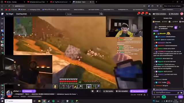 01:31:28Der Streamer meldet sich nach Tagesabwesenheit in Minecraft an und stellt fest, dass seine gesamte Farm zerstört wurde: Kühe abgeschlachtet, Items gestohlen und die TNT-Farm sabotiert. Er vermutet Sabotage durch andere Spieler, da er selbst keine Konflikte hatte. Gemeinsam mit Fabo repariert er die TNT-Farm, bemerkt aber, dass weiterhin Items gestohlen werden. Die Diskussion dreht sich darum, dass permanente AFK-Zeiten auf dem Server ausgenutzt werden und die Spieler sich gegen Angriffe wappnen müssen. Der Streamer fordert Lösungen gegen Diebstähle, während im Chat über den Verbleib von Gunpowder-Vorräten spekuliert wird.