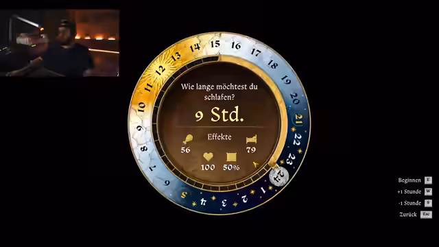 08:56:59Während der Inventarverwaltung entdeckt der Protagonist eine „tote Ratte“ und eine „Farbe“, die für eine längst vergessene Quest benötigt worden wäre, was zu Belustigung und Frustration führt. Die Farbe war für eine Kuh gedacht, die vor Wochen hätte angestrichen werden sollen, was die Langzeitwirkung von Quests im Spiel verdeutlicht. Nach dem Aufräumen des Inventars und dem Verkauf weiterer Gegenstände, die nicht mehr benötigt werden, plant der Protagonist, sein Glück beim Würfelspiel zu versuchen. Die Vorfreude auf das Würfelspiel wird jedoch schnell von Frustration abgelöst, da die Würfel des Gegners manipuliert zu sein scheinen und der Protagonist immer wieder verliert. Trotz der anfänglichen Begeisterung und der Hoffnung auf einen Gewinn, führt das Würfelspiel zu weiteren finanziellen Verlusten und einer steigenden Wut über die scheinbar unfaire Spielmechanik. Die Situation eskaliert, als der Protagonist den Gegner im Spiel tötet, was zu einem Gefühl der Reue führt und die Frage aufwirft, ob das Speichern des Spiels in diesem Zustand moralisch vertretbar ist.