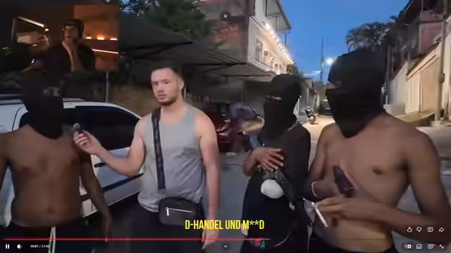 00:06:15Der Streamer trifft in einer der Favelas auf Mitglieder einer Gang. Er beschreibt die angespannte und paranoide Atmosphäre, da man sich in einem Gebiet rivalisierender Fraktionen befindet. Die Mitglieder sind mit schweren Waffen, darunter automatischen Gewehren und Handgranaten, ausgestattet. Sie erklären ihre unterschiedlichen Rollen, von Kämpfern bis zu Sicherheitspersonal, und zeigen, wie sie auf potenzielle Angriffe reagieren.