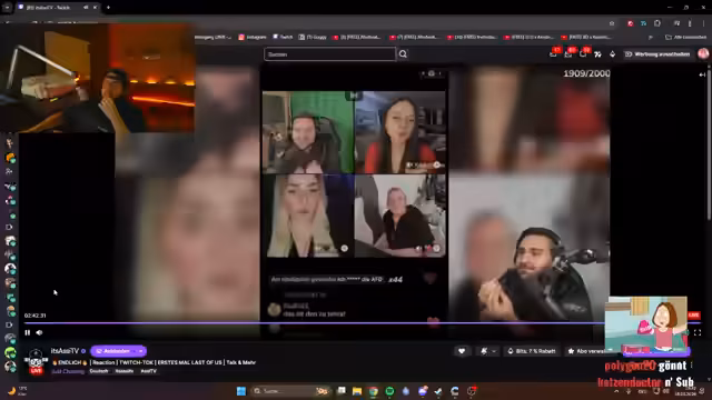01:30:08Der Stream beginnt mit einem technischen Problem, bei dem ein unerwarteter Restream auf Twitch entdeckt wird, ohne vorherige Zustimmung. Dies führt zu sofortiger Verärgerung und der Feststellung, dass das Gesicht der Streamerin, Frau Pommespanzer, jetzt im Internet sichtbar ist. Die Situation eskaliert zu einem heftigen Streitgespräch zwischen mehreren Personen, beleidigende Äußerungen werden ausgetauscht, und es kommt zu gegenseitigen Vorwürfen und der Unterstellung von politischen Aussagen.