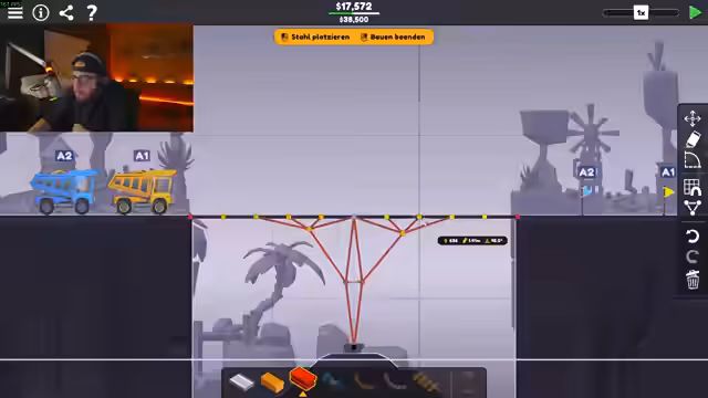 02:00:07Nach dem ersten erfolgreichen Level wird die Schwierigkeit im Spiel 'Poly Bridge' deutlich erhöht. Das Team muss nun mit einem begrenzten Budget eine stabile Brücke bauen, was zu mehreren Fehlversuchen und steigenden Frustrationsleveln führt. Sie verbrauchen das Budget und sind gezwungen, ihre Strategie zu überdenken und das Konstrukt zu optimieren.