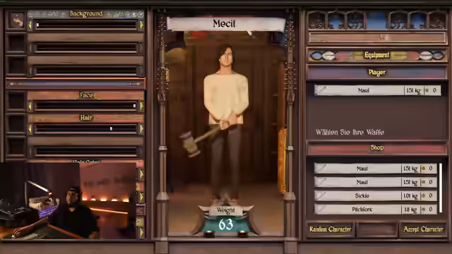 01:47:03Der Stream beginnt mit dem Einstieg in ein neues Spiel. Nach einer kurzen Einführung und einem verschluckten Teil, wird der Fokus auf die Charaktererstellung gelegt. Der Streamer erkundigt sich nach Vorschlägen für einen Namen für seine Spielfigur und entscheidet sich nach kurzer Beratung für den Namen 'Heinrich'. Im Anschluss wird die Ausrüstung angepasst und das Gameplay beginnt. Die anfänglichen Kämpfe gestalten sich einfach und werden schnell gewonnen.