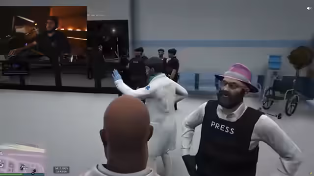 08:34:52Die Eskalation zieht nun die Presse an, speziell das Team von Weezinus News, das über einen angeblichen 'Snitch' informiert wurde. Reporter treffen am Eingang des PD ein, um über die Vorfälle zu berichten. Der Streamer interagiert mit der Presse und bittet sie, sich im Presseraum zu versammeln. Es kommt zu chaotischen Szenen, bei denen die Presse um Aufklärung bittet, während das Personal des PD versucht, die Situation zu kontrollieren und die Reporter aus dem Verhörraum zu entfernen.