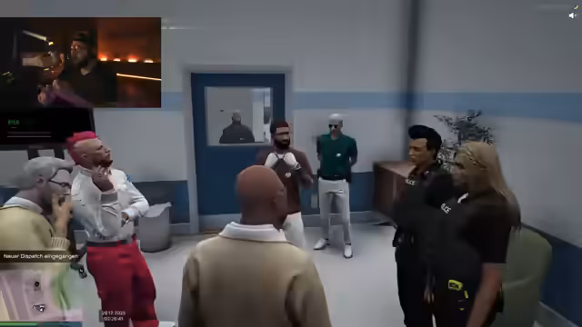00:25:38Nach kurzer Vorbereitung und dem Start des Servers beginnt der Stream mit einem spontanen Rollenspiel. Der Streamer schlüpft in die Rolle eines Polizeibeamten namens Herr Oleke, der sich mit einem Kollegen, Herrn Kamm, unterhält. Die Szene beginnt harmlos, entwickelt sich schnell zu einem hektischen Konflikt und eskaliert zu einer Reihe absurder und dramatischer Ereignisse.
