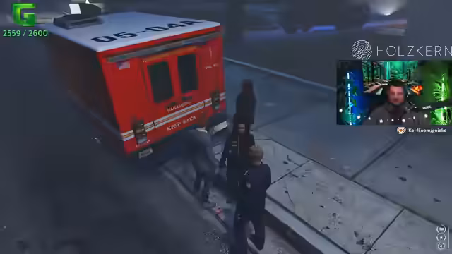 03:28:30Der Stream endet mit einem kritischen Vorfall. Während der Fahrt mit dem neuen Auto, wegen der schlechten Sicht durch Schneefall, kommt es zu einem Unfall, bei dem ein Passagier aus dem Auto geschleudert wird und verletzt am Boden liegt. Es wird eine ausführliche Erste-Hilfe-Maßnahme durchgeführt, wobei die Verletzungen als Schürfwunden eingeschätzt werden. Ein Rettungswagen wird gerufen, der Verletzte lehnt jedoch die Einnahme von verschreibungspflichtigen Schmerzmitteln ab, was die Situation zusätzlich erschwert.