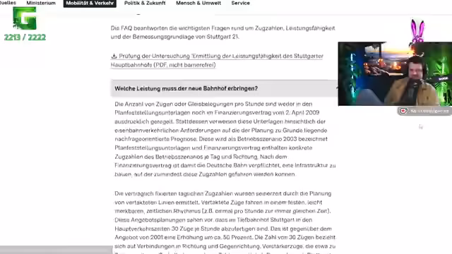 01:21:00Der Stream beleuchtet die komplexe Geschichte des Bahnhofsprojekts Stuttgart 21, das bereits in den 90er Jahren mit dem Ziel einer Modernisierung des Stuttgarter Hauptbahnhofs initiiert wurde. Ein zentrales Thema ist die enge Verflechtung zwischen der Deutschen Bahn und der Autolobby, insbesondere Daimler. Kritiker vermuten, dass die Autoindustrie kein Interesse an einer erfolgreichen Eisenbahninfrastruktur haben könnte, um die Bedeutung des Autos nicht zu schwächen. Die Kosten für das Projekt sind seitdem explodiert, von ursprünglich geschätzten 6 Milliarden Euro auf zuletzt über 11 Milliarden Euro, was zu langen Rechtsstreitigkeiten zwischen der Bahn und dem Bundesland Baden-Württemberg führte. Finanziell wird das Projekt als finanzielle Katastrophe beschrieben, die gleichzeitig gesellschaftlich spaltend wirkt.