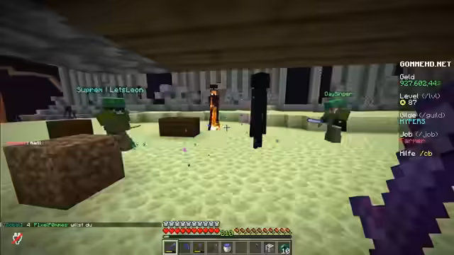01:42:38Ein neues PvP-Event unter Lorenz' Regie beginnt mit ungleichen Kits (Nahkampf ohne Rüstung vs. Fernkampf) und unbegrenzten Leben. Boogie-Bomben sorgen für Chaos, da sie Spieler verlangsamen und in die Luft werfen. Der Streamer kämpft gegen Lenny und andere, wird mehrfach getötet, aber durch Respawn-Mechaniken bleibt die Runde aktiv. Es folgen Trolling-Aktionen, Diskussionen über die Boogie-Bomb-Balance und abschließend ein großer Kampf im Dorf, bei dem GommeHD trotz Rüstungsunterstützung stirbt. Das Event wird als gelobt, aber technisch herausfordernd bewertet.