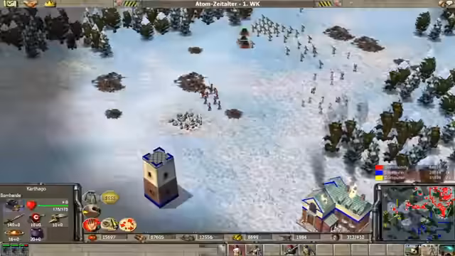 03:43:25Nach dem Eintritt in das Atomzeitalter stehen neue Waffensysteme wie Hubschrauber und Cyborgs zur Verfügung. Die Offensive gegen die verbliebenen Gegner, insbesondere Blau, wird intensiviert. Die Gegner können nicht mehr mithalten und werden durch gezielte Angriffe mit modernsten Einheiten schrittweise eliminiert. Das Spiel wird schließlich durch die Zerstörung der gegnerischen Hauptstrukturen gewonnen.