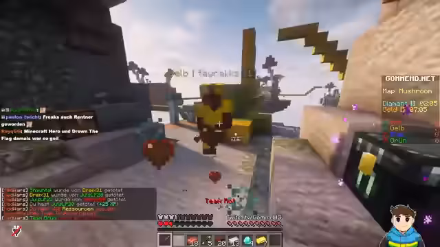 02:26:10Der Streamer lädt die Zuschauer zu einem kleinen Duels-Turnier in Lobby 6 mit einem Skywars-Kit ein, um den besten PvPer im Chat zu finden. Anschließend wird eine Runde Bedwars mit FreaksLP gespielt. Dabei werden die neuen Regeln und Upgrades des Spiels erklärt, wie Diamanten-Upgrades für Schärfe und Schutz, die auf Zwischeninseln gefunden werden können. Es gibt auch nützliche Items wie den Bett-Builder. Während des Spiels kommt es zu intensiven Kämpfen und strategischen Entscheidungen, wobei das Team von FreaksLP und dem Streamer trotz anfänglicher Schwierigkeiten und Missverständnisse eine spannende Runde gewinnt.