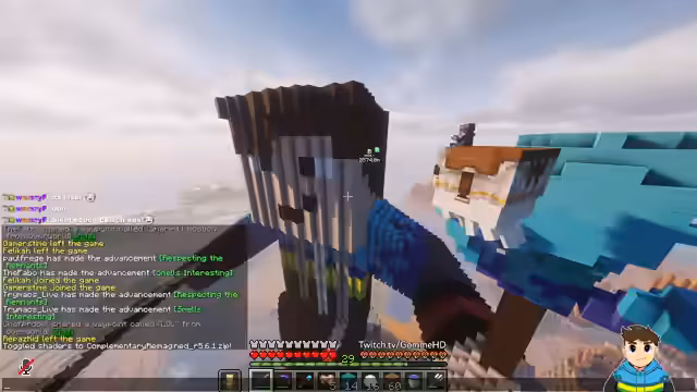 01:07:21Der Streamer gibt auf, die Glaskugeln fertigzustellen, und reist stattdessen mit seiner Elytra zum Eiffelturm. Er ist beeindruckt von der fertiggestellten Struktur und tributiert den Erbauern. Das Event dient als kurze, entspannte Pause vom stressigen Bauen. Nach der Generalprobe und einer kurzen Ansprache beschließt er, jedoch wieder zu seiner Basis zurückzukehren, da er sich von der Bauarbeit ablenken lässt und das Gefühl hat, die Statuenkomponenten nicht heute abschließen zu können.