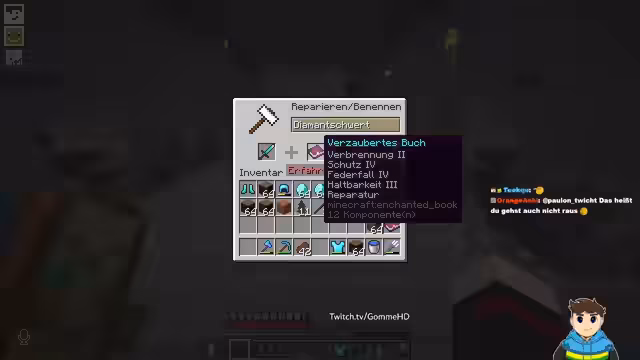 01:51:52Der Streamer trifft bei Gambo ein und beginnt mit dem Farmen von Wither-Skeletten, um Köpfe für den Beacon zu sammeln. Nach anfänglichem Pech gelingt es ihm, einen Kopf zu erhalten. Gleichzeitig arbeitet er an der Verzauberung seines Dreizacks und seiner Rüstung. Ein Highlight ist der Erfolg beim Verzaubern des Schwertes, das anschließend als übermächtig beschrieben wird und den Streamer voller Stolz erfüllt, seine Ausrüstung nun fertiggestellt zu haben.
