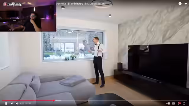 00:25:59Der Streamer präsentiert ein Haus in Falkensee, das er besichtigt. Er beschreibt die modernen architektonischen Elemente wie eine Plexiglasscheibe, die wie ein Aquarium wirkt, und eine hochmoderne Küche. Er erwähnt die Herausforderungen bei der Größe von 400 Quadratmetern und das Bedürfnis nach einer smaller, statement Wohnung in Berlin.
