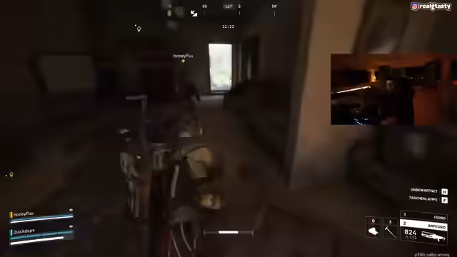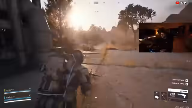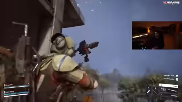 04:05:27Das Gameplay nimmt stark an Fahrt auf. Der Streamer und sein Gegenüber sind in ständiger Bewegung, um Gegner auszuschalten, werden aber von Drohnen angegriffen. Die Kommunikation ist sehr schnell, mit Befehlen, Schreien und Beleidigungen im Spiel. Eine hektische Szene ereignet sich, in der die beiden fast von einer Drohne getötet werden, aber gerade noch in Sicherheit gelangen können. Die spannungsgeladenen Situationen erzeugen eine hochenergetische Atmosphäre.
