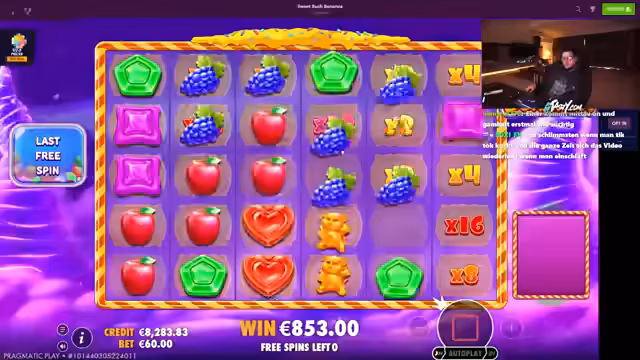 02:55:29Die Session wechselt zu einer sogenannten Bonushand, bei der mehrere verschiedene Slots wie B-B-B-Boyser, Extra Juicy, Sugar Rush und Doghouse hintereinander gespielt werden, um Bonus-Funktionen auszulösen. Der Streamer sammelt erfolgreich Freispiele in den verschiedenen Spielen und feiert Gewinne, die den Gesamtbetrag deutlich in den Plusbereich bringen.