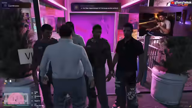 03:27:40Im Verlauf des Streams kommt es zu einer fortwährenden Auseinandersetzung zwischen einem Clubbesucher und dem für die Qualitätsmanagement zuständigen Beamten. Der Besucher fordert vehement seinen Einlass in den Club, wird jedoch aufgrund mitgebrachter Waffen und eines konfrontativen Verhaltens zunächst abgewiesen. Es kommt zu einem hitzigen Dialog, in dem der Beamte den Besucher mehrmals auffordert, seine Waffen in sein Fahrzeug zu packen, sich durchsuchen zu lassen und sich auszuweisen, was der Besucher mit Aggressionen und Beleidigungen beantwortet.