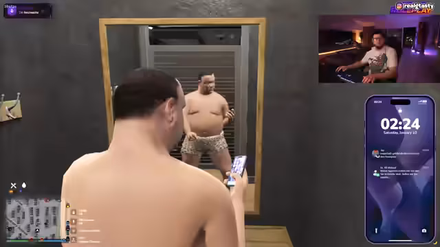 01:27:49Der Streamer wechselt in ein GTA Roleplay-Szenario, in dem er als 'Geisel' von zwei Männern gehalten wird. Er nutzt seine Kreativität, um die Situation zu entschärfen, indem er anbietet, eine Insta-Story zu machen, in der die Männer als 'krassest' dargestellt werden. Die Situation ist gespannt, mit Waffengewalt, bis der Streamer vorschlägt, einen Song zu singen, um die Stimmung aufzulockern und die Waffen niederzulegen.