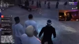 02:11:05Im Rahmen der fortgesetzten Rollenspiel-Szene kommt es zu einem Hundekampf zwischen Anubis (FIB-Hund) und Bello (Hund von Peppi). Der Streamer inszeniert dabei eine Parodie auf einen Boxkampf mit Kommentator und Publikum. Die Szene eskaliert durch die Ankunft mehrerer Charaktere und die Ankündigung einer Razzia durch Moser 007 gegen afrikanische Gangs.