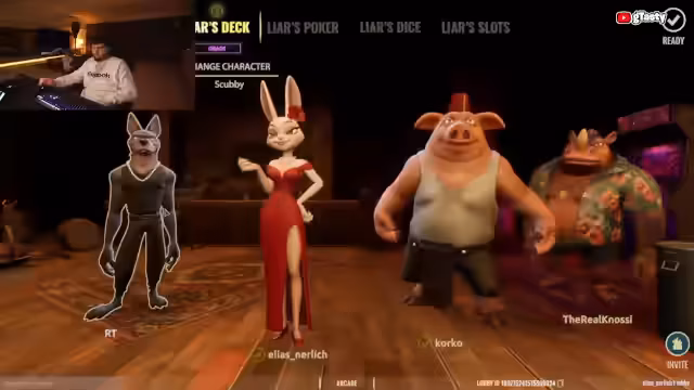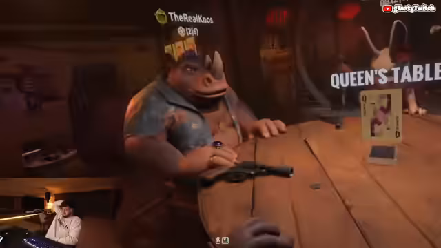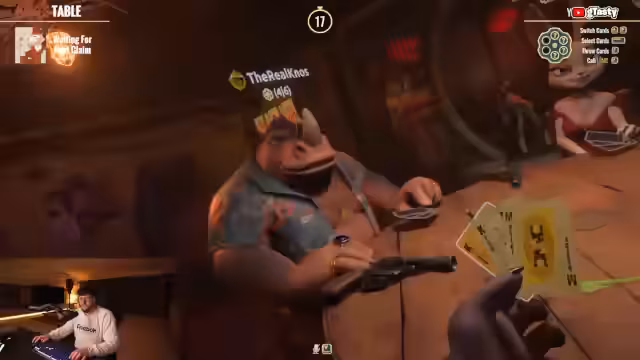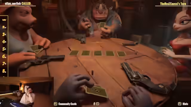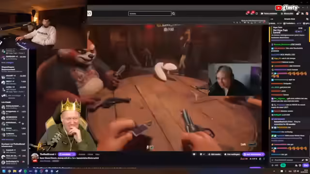05:28:53Das Stream-Startgespräch dreht sich um die Erklärung eines komplexen Kartenspiels, bei dem Spieler auf Tischen wie dem Queens-Table Karten legen müssen. Die Mechanik beinhaltet Bluffen, gezieltes Aufdecken mit der X-Taste und das Abfeuern von Kugeln durch falsches Spiel. Ein Spieler gerät in die Zange, als sein Mitspieler ihn aufdeckt und er sich schießen muss, was zu großer Aufregung und zum ersten Ausscheiden eines Teilnehmers führt.