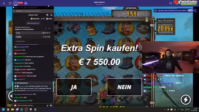02:10:07Nach dem Gewinnspiel wird wieder das Casinogespiel fortgesetzt. Der Streamer beleidigt dabei virtuelle Spielautomaten, um deren Auszahlungsverhalten zu provozieren. Er unterhält sich mit dem Chat über verschiedene Themen und kommentiert daraufhin die Anweisungen im Spiel, wobei er sich über die absurd hohen Einsatzmöglichkeiten und das mangelnde Verständnis im Chat für Spielstrategien äußert.