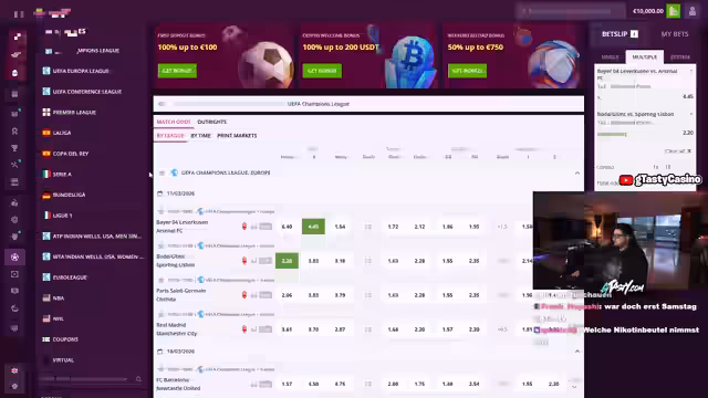 00:06:37Die Themen drehen sich um anstehende Sportereignisse und Wetten. Ein Sportwetten-Schein für Freitag im Wert von 118.000 Euro wird angekündigt. Der Streamer diskutiert eine spezifische Fußballwette für den aktuellen Tag, wie Arsenal gegen Leverkusen, betont jedoch, dass er solche Wetten eher nach Bauchgefühl als nach sorgfältiger Analyse platziert. Es wird ein großes Interesse an Wetten auf Oktagon-Kämpfe geäußert, wobei der Streamer einen dicken Schein für das nächste Event verspricht.