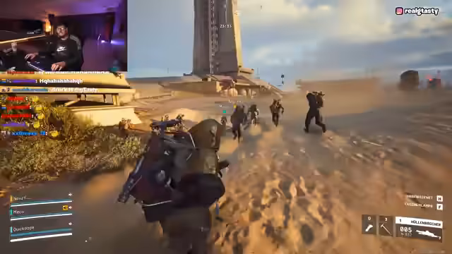06:13:22Die Mission beginnt mit einem koordinierten Angriff auf die Basis der 'Königin'. Das Team agiert strukturiert, verteilt sich, um sich zu schützen, und konzentriert das Feuer auf gegnerische Roboter. Es kommt zu heftigen Gefechten, bei denen der Streamer seine Mitspieler anleitet und deren Positionen kommentiert. Das Ziel ist es, die Bastionen zu zerstören und den Weg freizumachen, um die Königin direkt angreifen zu können.