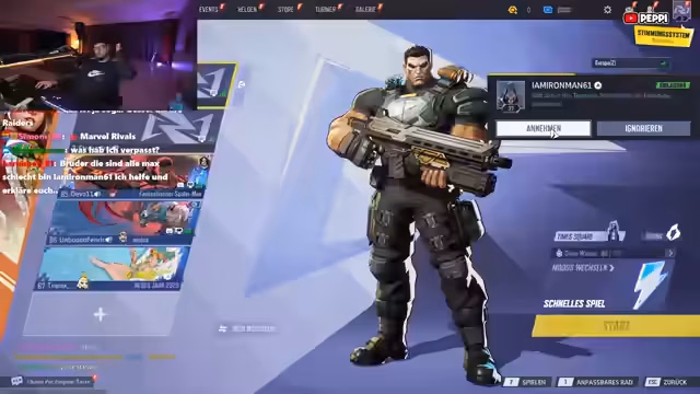 06:40:55Ab 24055 Uhr wird Marvel Rivals als neues Multiplayer-Spiel vorgestellt, wobei der Streamer und Zuschauer den Download über einen bereitgestellten Link anstoßen. Das Spiel wird als leicht zugänglich mit vielen Charakteren beschrieben, darunter Deadpool, der als erster Held alle drei Rollen (Angriff, Verteidigung, Support) bedienen kann. Der Streamer zeigt Begeisterung für das Gameplay und kündigt ein gemeinsames Spiel an. Obwohl Placement-Events nur für den aktuellen Tag geplant sind, wird späteres gemeinsames Zocken in Aussicht gestellt, sobald alle Teilnehmer das Spiel heruntergeladen haben.