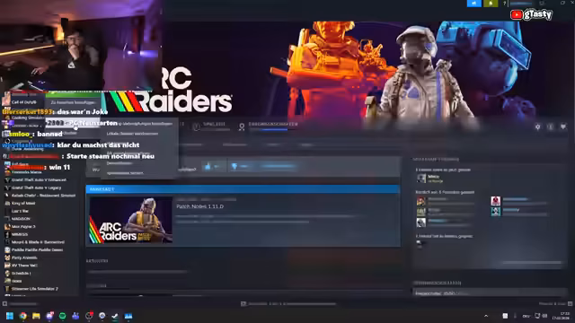 02:05:38Der Streamer will das Spiel Arc Raiders starten, stößt jedoch auf massive technische Schwierigkeiten. Der Startvorgang scheitert mehrmals an einem Anti-Cheat-System, das sich nicht beenden lässt. Er verbringt viel Zeit mit der Fehlersuche und erhält Ratschläge vom Chat. Nach einem Neustart von Steam und dem Schließen anderer Prozseme kann er das Spiel endlich erfolgreich starten. Der Streamer nutzt die Wartezeit, um seine Internetverbindung zu bewundern und einen Speedtest zu zeigen.