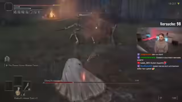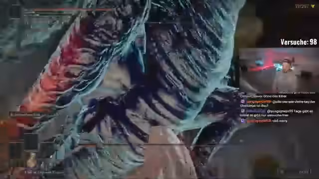 04:02:33Während der Streams tauchen verschiedene Gegner auf, gegen die der Streamer unterschiedliche Taktiken anwendet. Er experimentiert mit verschiedenen Waffen und Ashes of War, um die effektivsten Angriffsmuster zu finden. Er findet Great Katanas besonders stark und probiert Kombinationen aus verschiedenen Statuswirkungen wie Gift, Blut und Frost aus. Gleichzeitig kämpft er mit DLC-Gegnern, die besonders herausfordernd sind und oft immun gegen bestimmte Effekte sind.