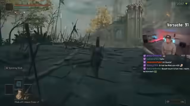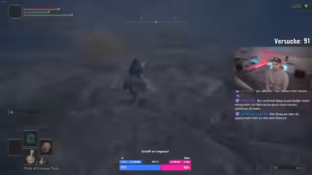 01:29:46Der Stream endet mit Gustavs Versuch, den ersten Boss Limgrave zu besiegen. Nach einem frustrierenden Tod erwähnt er, dass sie einen neuen Rekord aufgestellt haben. Er stellt fest, dass die Region Limgrave für ihn besonders herausfordernd ist, da er das Gefühl hat, man sollte hier nicht sterben. Trotz der Schwierigkeiten bleibt er motiviert und betont, dass Musik ein wichtiger Grund für seine Aktivität auf Twitch ist.