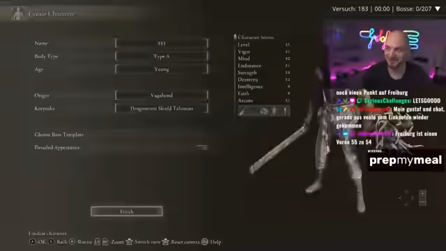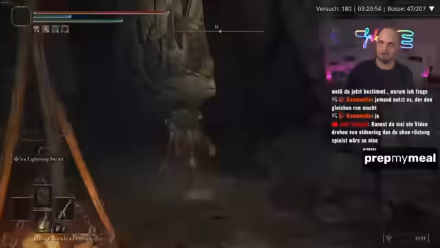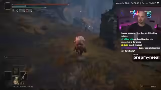 03:32:12Der Streamer kämpft gegen Bosse im Elden Ring Randomizer mit Plus-Null-Bedingungen und ohne Waffenleveln. Er schildert mehrere schwierige Kämpfe, darunter gegen Bale und einen unbenannten, hartnäckigen Gegner, bei denen Positionierung, Ausdauer und rng-bedingte Faktoren den Kampfverlauf maßgeblich beeinflussen. Bei einigen Kämpfen fühlt er sich in der Arena benachteiligt, während ihm andere, wie der Sieg gegen Bale, besonders zufriedenstellend erscheinen.