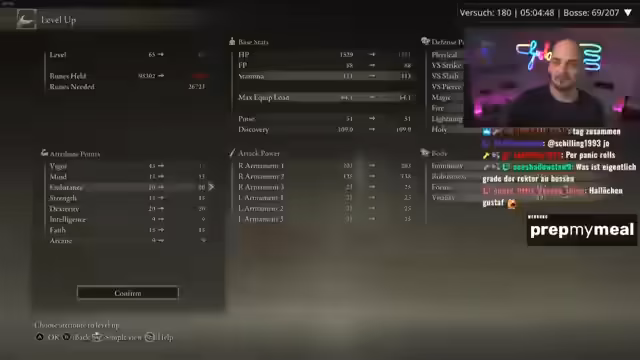 03:59:27Der Streamer erreicht wichtige Meilensteine, wie Level 69, und sammelt weiterhin Items und Runen. Er zeigt seinen Inventarbestand und stellt fest, dass er bereits 89 von 99 Bossen besiegt hat. Die Stimmung ist gemischt aus Freude über den Fortschritt und Frust über verpasste Gelegenheiten und den langen Weg, der vor ihm liegt.