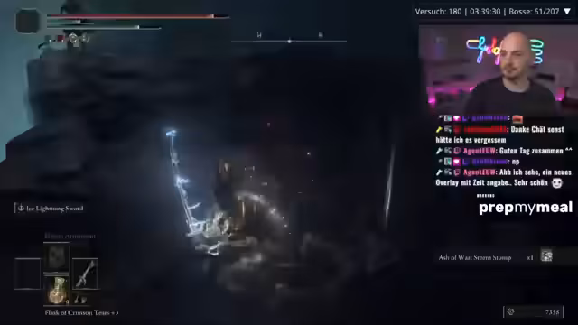 02:04:40Der Streamer konfrontiert einen weiteren, sehr starken Gegner, der ihn gefährlich unter Druck setzt. Er sammelt im Kampf Items, um seine Ressourcen aufzufüllen, und kämpft mit seiner aktuellen Waffe, die aber nicht den gewünschten Schaden anrichtet. Er diskutiert im Chat über verschiedene Waffen und ihre Eignung für bestimmte Gegner und Bosskämpfe. Er äußert den Wunsch nach einer stärkeren Waffe wie dem Inspire Rapier, aber bisher muss er mit dem zurechtkommen, was er gefunden hat. Er ist motiviert, weiterzumachen, aber auch verärgert über die hohen Anforderungen des Spiels.