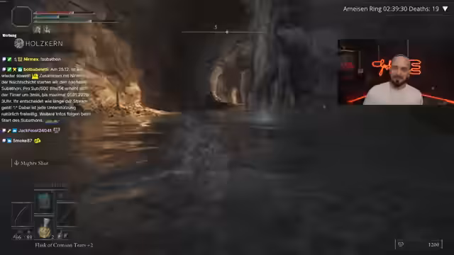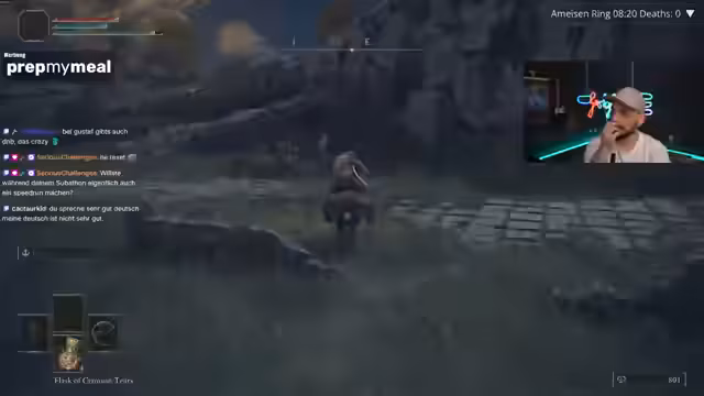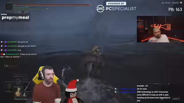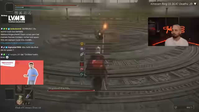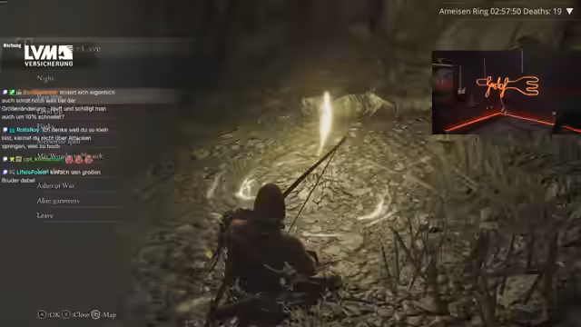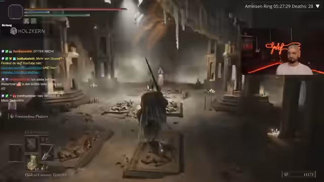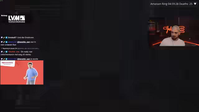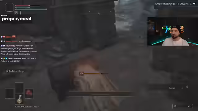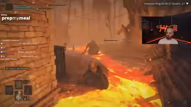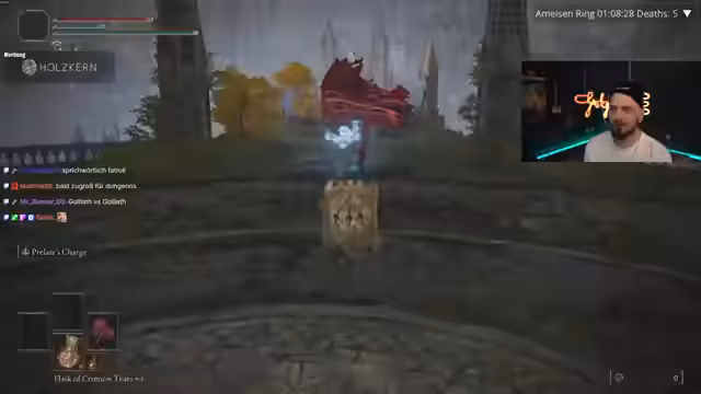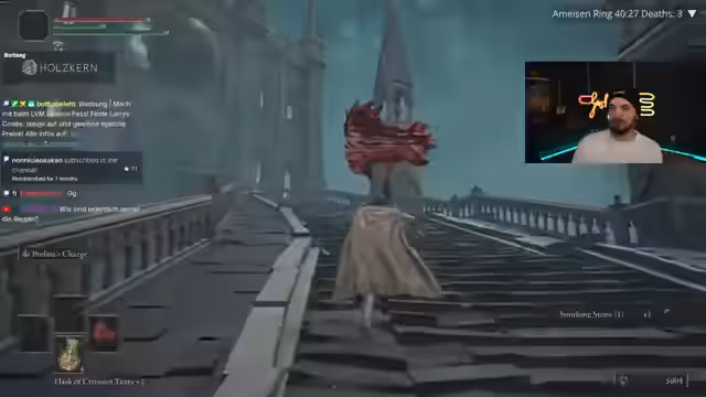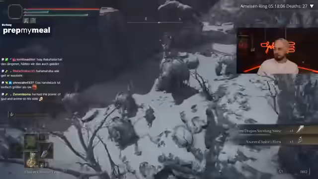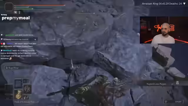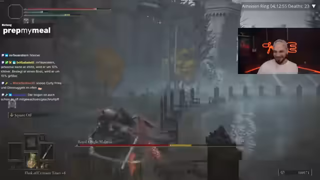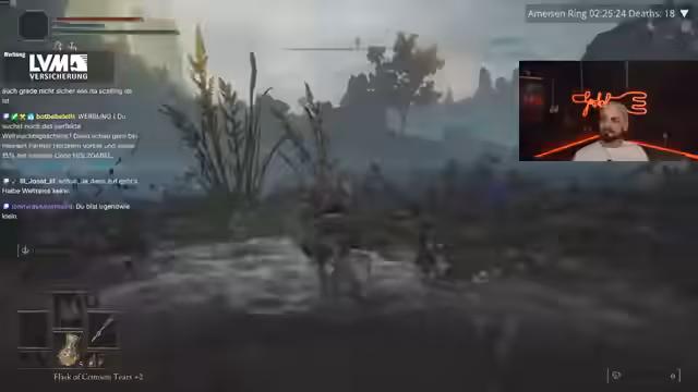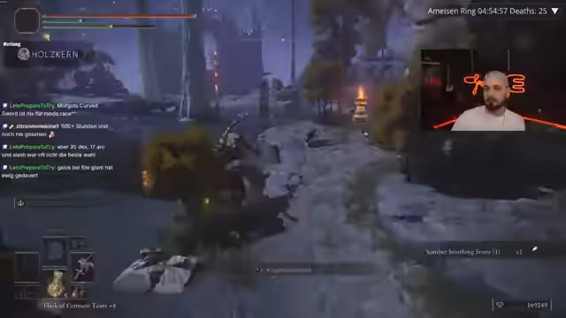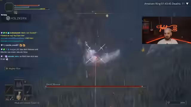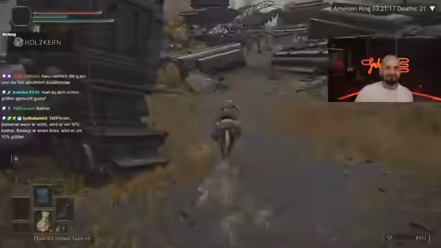 04:21:46Der Streamer kämpft in Elden Ring mit der Herausforderung, bei jedem Tod kleiner zu werden. Nach einem erfolgreichen Schuss auf einen Gegner stellt er fest, dass größere Gegner nach einer Leiter deutlich schwieriger sind. Trotz anfänglicher Erfolge bei 30% Größe äußert er Frustration über die harschen Bossgegner in Limgrave, die ohne adäquate Waffen kaum zu besiegen sind. Die Diskussion mit dem Chat dreht sich um Strategien, um durch das Töten von Bossen wieder größer zu werden, was jedoch durch vergiftete Gegner und mangelnde Schadensausbeute erschwert wird.