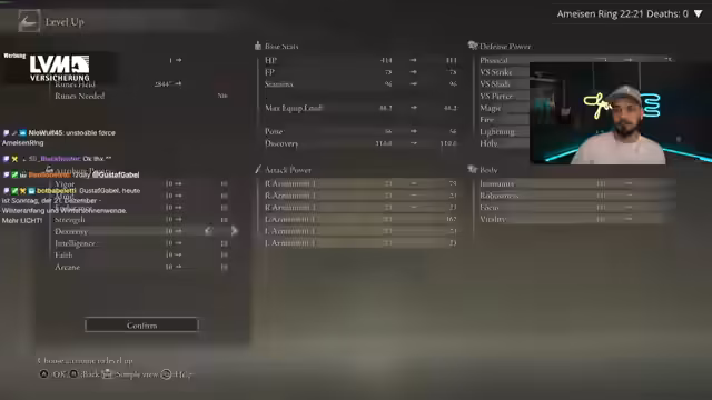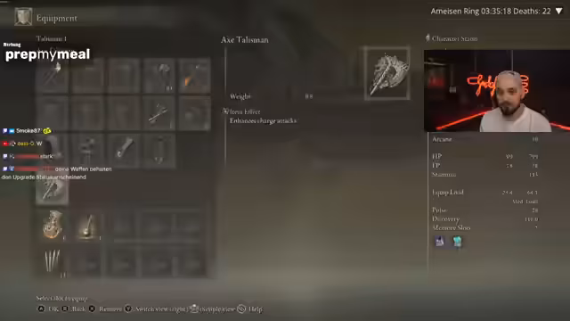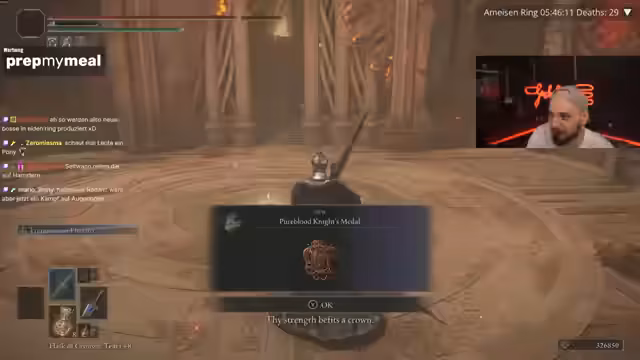 00:30:17Der Streamer erhält den Prelate's Crozier, eine große Hammer-Waffe mit hoher Reichweite, die jedoch 45 Stärke benötigt und sehr schwer ist. Er steht vor der Entscheidung, die Waffe zu upgraden oder nicht. Nach einem weiteren Tod (80% Größe) wird die zunehmende Herausforderung klar: Weniger Ausdauer, kürzere Sprünge und geringere Laufgeschwindigkeit erschweren Kämpfe. Gleichzeitig ermöglicht die große Waffe aber gezieltere Treffer. Ein Kampf gegen den Red Wolf of Radagon verläuft erfolgreich und bringt die Größe auf 90% zurück.