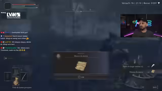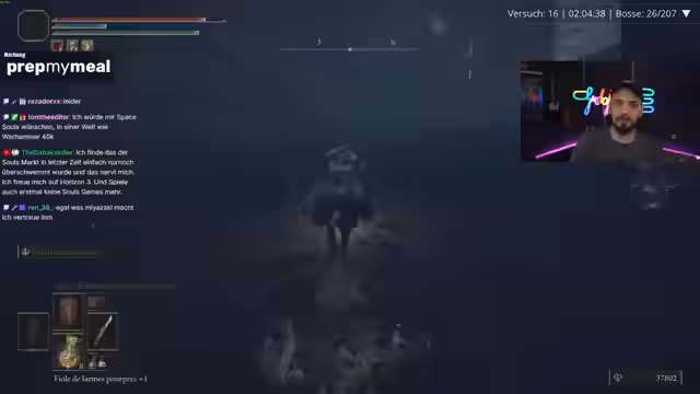 04:21:37Der Streamer wiederholt die Spielregeln: alle Bosse ohne zu sterben, alle automatisch ausgerüsteten Items und nur die bei Bossen gefundenen Talismane. Er nennt diese Regel "unangenehm" und erinnert sich, dass er viel gearbeitet und versucht hat, dem gerecht zu werden. Er bekommt positive Rückmeldungen von Chat-Mitgliedern, die ihn loben, was er sehr zu schätzen weiß.