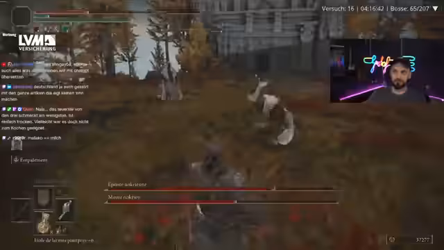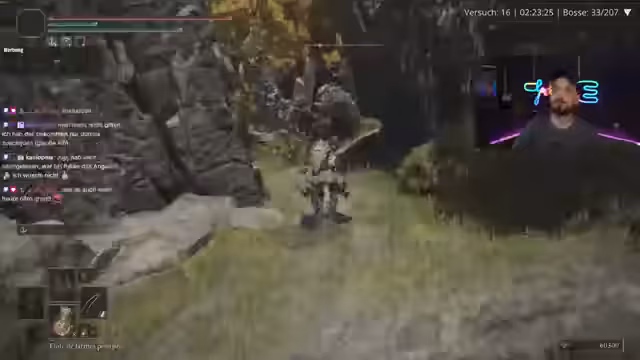 01:32:42Der Stream konzentriert sich auf das Gameplay der französischen Herausforderung im Spiel Elden Ring. Der Streamer diskutiert aktiv mit dem Chat über Kampfstrategien, insbesondere gegen Boss-Gegner. Er beklagt sich über die aktuelle Waffe, die ihm nicht zusagt, und beschreibt den Kampf gegen einen Gegner, bei dem er knapp dem Tod entging und mehrere Male überlebt hat. Die Analyse der Angriffe der Gegner, deren Reichweite und Geschwindigkeit, ist zentral für die Vorgehensweise.