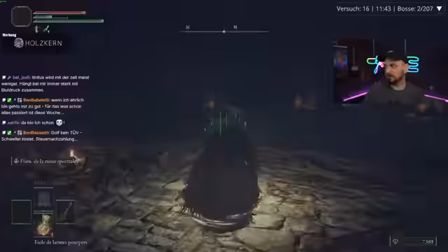 00:07:01Das Hauptthema des Streams ist die Wiederaufnahme der French Challenge. Der Streamer stellt die genauen Regeln der Challenge vor: All Bosses, No Death und Use What You Get, was bedeutet, dass alle aufgesammelten Talismane automatisch angelegt werden und ein Upgrade der Waffen schwierig ist. Es werden erste Gegner in der Anfangszone bekämpft und es wird deutlich, dass die neue, gefundene Waffe stark ist, aber die Talismane, insbesondere einer, die das Ausweichen erschwert, den Kampf erschweren.