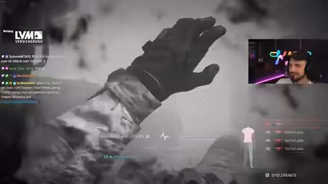01:25:11Nach den technischen Anlaufschwierigkeiten beginnt der Streamer in einem kleineren, als chaotisch beschriebenen Spielmodus: Squad Deathmatch. Die Map ist als unübersichtlich und groß wahrgenommen, was den Einstieg erschwert. Das Gameplay wird als intensiv und stressig beschrieben, der Streamer ist ständig Beschuss ausgesetzt, verliert aber auch selbst das Leben häufig. Er versucht, das Ziel zu erfüllen, Waffen freizuschalten und seine Squad-Mitglieder zu unterstützen, was jedoch durch die ständigen Todesfälle erschwert wird.