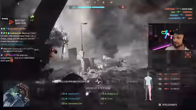 00:19:34Nachdem die technischen Vorbereitungen abgeschlossen sind, stürzt sich der Streamer ins Spiel. Er wählt die Sturmklassen und erkämpft sich in Squad-Deathmatch-Runden die ersten Erfahrungen. Das Gefühl der Verwirrung ist anfangs groß, da die Karten ungewohnt sind und das Spielgefühl, besonders bei der Waffenhandhabung, als schwammig beschrieben wird. Trotzdem gelingen erste Erfolge und Killstreaks, was den Spaßfaktor steigert.
