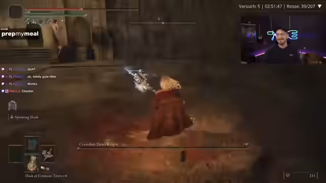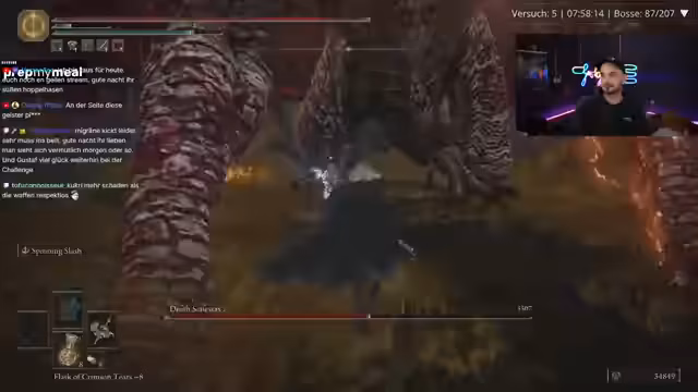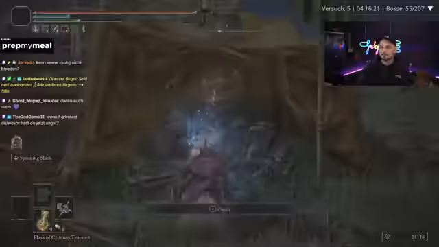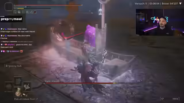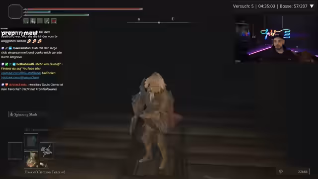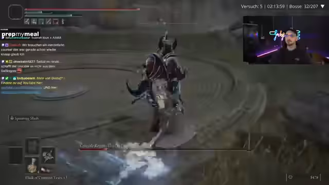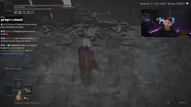 03:47:10Die Herausforderungen des Elden Ring Randomizer-Modus stehen im Mittelpunkt. Der Streamer kämpft gegen einen Boss, der hohen Schaden verursacht und dessen Attacken schwer einzuschätzen sind. Die Strategie basiert auf Statuseffekten wie Frost und Gift, die jedoch den Kampf nicht vereinfachen. Er beschreibt die zunehmende Schwierigkeit des Gebiets, die Respawn-Mechanik von Gegnern und die Freude an einem erfolgreich abgeschlossenen, wenn auch anstrengenden Kampf, trotz fehlender Items.