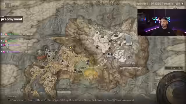 01:25:11Der Streamer betritt die DLC-Inhalte von Elden Ring und zeigt sich beunruhigt über die dortigen Gegner, die als extrem gefährlich beschrieben werden. Im Gegensatz dazu kritisiert er Mods wie "Nightmare Mod", die er als "Bullshit und unfair" bezeichnet, da sie nur Frust erzeugen sollen. Er demonstriert stattdessen einen "Cheese"-Spot, bei dem er einen Boss an einer Kante festhält, und klärt den Unterschied zwischen "Cheaten" und "Cheesen" im Gameplay.
