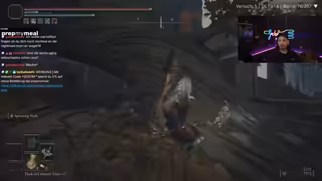 00:01:11Der Stream beginnt mit einer Vorstellung des Kanals und der Challenge "AllBnoD+0 Rando", bei der keine Waffe aufgewertet wird. Der Streamer begrüßt seine Zuschauer und beginnt mit dem Spiel Elden Ring, wobei er die Herausforderungen des Randomizers beschreibt. Er erwähnt, dass er bereits einige Bosse wie Malenia, Radahn und Godrick im No-Scaling-Modus besiegt hat, was den beeindruckenden Spielstand unterstreicht.