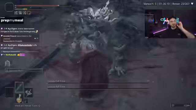 04:09:32Ein dramatischer Moment ereignet sich, als ein Boss unerwartet teleportiert und eine Welle von Angriffen einleitet, die den Streamer überwältigen. Der Streamer zeigt sich sichtlich frustriert und überfordert von der unfairen Situation, die sich plötzlich entwickelt. Es wird versucht, die Kontrolle zurückzugewinnen, doch der Schaden ist bereits immens. Der Fokus liegt auf der unvorhersehbaren Natur des DLC-Gegners und dem fehlenden Ton als zusätzlicher Stressfaktor.