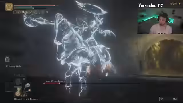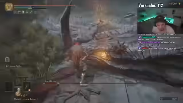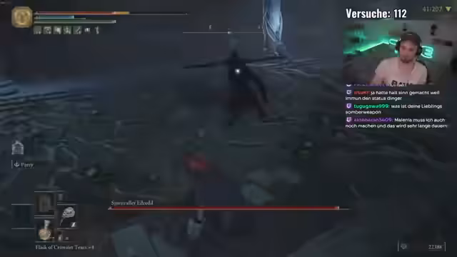 00:19:10Trotz des anfänglichen Erfolgs wird der Streamer im Kampf gegen Margit getötet. Er merkt an, dass er bei einem Bug-Tod den Run nicht als verlorene Zählung ansieht, da er sich noch nicht vollkommen gesund fühlt. Nach dem Tod diskutiert er ausführlich über seinen gesundheitlichen Zustand; er fühlt sich körperlich etwas besser, hat aber weiterhin Kopfschmerzen und ein Gefühl der mentalen Trübung. Dadurch sind ihm neue Projekte derzeit nicht möglich. Er hofft aber, in naher Zukunft wieder zu anderen Spielen und Challenges zurückzukehren.
