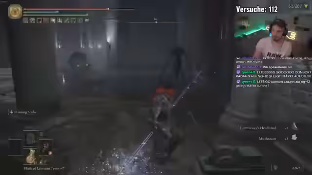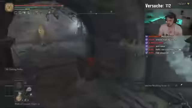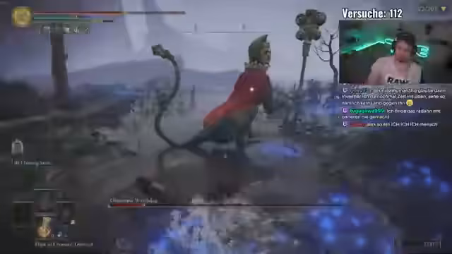 03:07:35Zu Beginn des Abschnitts berichtet der Streamer von unerwarteten Ereignissen, wie einem plötzlichen Absturz in einen Abgrund und einem Frosch, der unerwartet über eine Reling springt. Er widmet sich anschließend verschiedenen Bosskämpfen im Rahmen der All-Bosses-No-Death-Herausforderung. Besonders erwähnt er Malenia, von der er Angst hat, und vergleicht sie mit anderen schwierigen Bossen wie Lament, wobei er die frustrierende und machtlose Situation bei bestimmten Kämpfen hervorhebt.