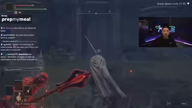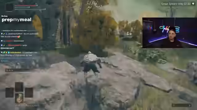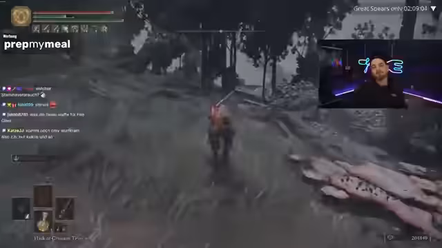 01:46:59Nach diversen Abschweifungen und technischen Unterbrechungen, wie einem versehentlichen Neustart des Programms und Diskussionen über Overlays, beginnt der Streamer mit eigentlichen Challenge. Es wird eine neue Spielreihe angekündigt, bei der ausschließlich Great Spears, eine spezifische Waffenklasse, verwendet werden werden. Die anfänglichen Waffen und die benötigten Attribute werden erläutert, bevor der Streamer sich auf den Weg macht, die erste Waffe, die Lanze, zu beschaffen, um den Run zu starten.