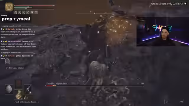 05:23:24Der Streamer spielt Elden Ring mit einer spezifischen Waffenauswahl, Great Spears, und testet deren Effektivität. Er entdeckt einen Bug im Spiel, bei dem die L1-Attacke des Schlangenjägers in der Arena von Raikard auch mit einer anderen Waffe des gleichen Typs funktioniert. Auch die klassische Taktik gegen Raikard mit Schildblock und schneller Angriff wird wiederholt thematisiert.